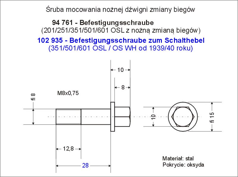 Poniżej prezentuję rysunek wykonawczy wspomnianej śruby, bazujący na oryginalnym, zachowanym egzemplarzu. Uwaga! w modelach 351/501/601 OSL były dwie wersje śruby różniące sie długością - starszy typ (do 1938 roku włącznie) o numerze katalogowym 94 761 oraz wydłużona śruba nowszego typu o numerze 102 935. Nowszy typ współpracował z grubszym o kilka mm elementem dystansowym, który był konieczny dla wprowadzonego uszczelnienia labiryntowego osi dźwigni. Mam nadzieję, że taki szkic się komuś się przyda.
